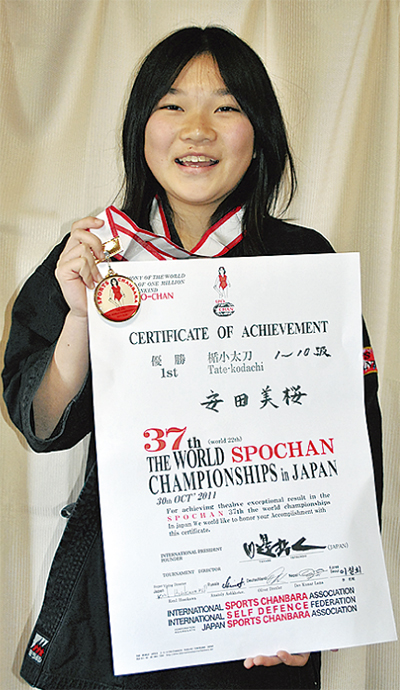 安田さんは6月の県大会において基本動作と女子の部で優勝。県代表として、東京代々木の国立オリンピック記念青少年総合センターで今秋開催された第37回スポーツチャンバラ世界選手権大会(国際スポーツチャンバラ協会ほか主催)に出場した。
