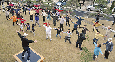 雨の日も雪の日も1日も休むことなく、イチ、ニ、サン、シ―。二宮町山西の杉崎惣一さんが自宅の庭を開放して実施している「二宮ラジオ体操の会」のラジオ体操が、4月1日で丸40年を迎えた。おなじみの軽快なメロディーに乗せて今日も老若男女が健康づくりに励んでいる。