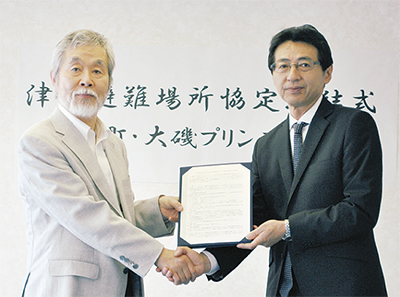 大磯町は大磯プリンスホテル(同町国府本郷)と「津波発生時における緊急避難場所としての使用に関する協定」を締結した。14日に同ホテルで調印式があった。