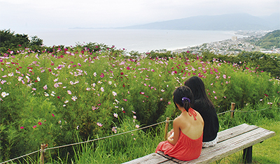標高136mの山頂付近には、ピンクや白、赤色のコスモスが一面に咲き、そよ風に揺らぐ。眼下には相模湾や伊豆半島が広がり、箱根や丹沢も眺めることができる。藤沢市から初めて訪れた夫婦は、「近くにこんな素晴らしいところがあるなんて」と感嘆の声をあげ、横浜市在住の女性グループはカメラ片手に、「きれいな写真がたくさん撮れた」と満足気に話していた。