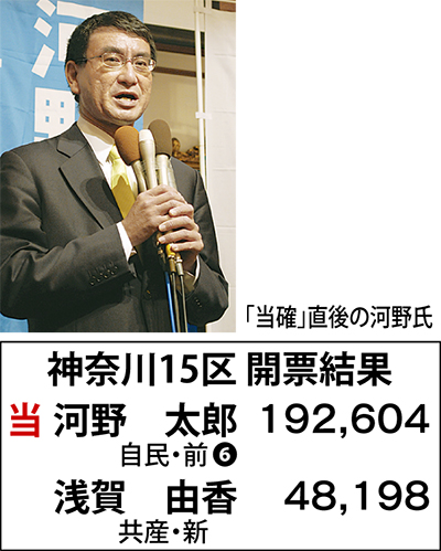 開票当日、平塚市内のホテルには河野陣営約300人が集まった。午後8時5分、早々にテレビが「当確」を報じると、河野氏は万歳する支持者に何度も頭を下げ、表情を崩した。「政治は内輪もめのためにやるのではないという意志で6回目の任期を果たす」と意気込みを述べた。