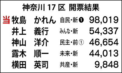 河野洋平元代議士の地盤を受け継いだ17区で牧島氏は手堅く組織票をまとめ、開成町を除く3市7町で得票1位。9万8019票を集め、3年3カ月ぶりに自民党の議席を奪還した。
