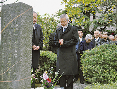 NHK大河ドラマの主人公・新島八重の夫で、同志社大学創設に尽力した新島襄の碑前祭が1月23日、大磯町で開かれた。命日にあたるこの日、終焉の地となった国道1号線沿い照ヶ崎海岸入口の信号脇にある碑には多くの人が駆けつけ、故人の遺徳を偲んだ。