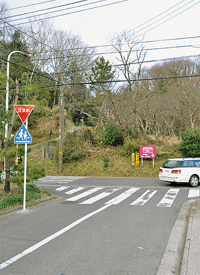 同交差点は、県道71号線の新西谷戸橋交差点とつながっている。マックスバリュやTSUTAYAがすぐ近くにあり、日中の県道は買い物などで行き交う車も多いが、県道から50m程東に入った旧道はバス通りになっているものの、交通量はまばらだ。