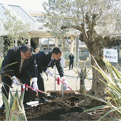 植樹祭には坂本孝也町長と池田宏町議会議長、松崎哲士郎支社長、島田秀夫二宮駅長らが出席。スペインから取り寄せた高さ約2・5m、樹齢100年を越えるオリーブの木に土を掛け、ローズマリーを植え込んだ。坂本町長は「駅南口に建つガラスのうさぎ像とともに、北口のオリーブを二宮町の平和の象徴にしていきたい」と話した。