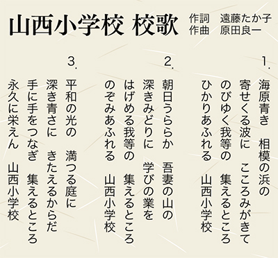 四季折々の自然の営みを感じられる吾妻山のふもとに二宮町で3番目の小学校として1977年開校。校歌はその翌年3月15日に制定された。
