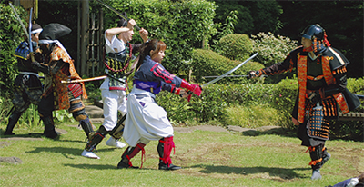 「大磯城山公園戦国時代絵巻」と題する創作時代劇が6月2日、同公園の茶室前庭園で上演された。手作りの甲冑などを着けた出演者が迫力ある立ち回りや殺陣を見せ、観客を沸かせた。
