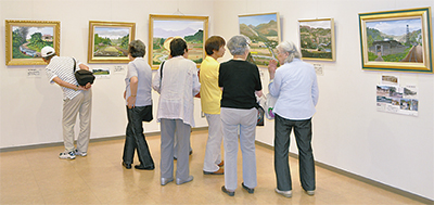 同町在住の桑原曻一さん(86)が20年かけて鉄道とともに当時の風景を描いた作品24点を展示。「絵に描いてある二宮小学校一色分校の隣の家は『私の家だ』と言って、思い出を話す人もいましたね」と桑原さん。
