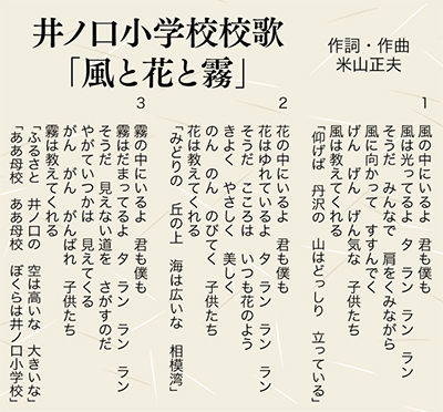 弾むように軽快なメロディーが特徴の校歌。作者は『リンゴ追分』など美空ひばりのヒット曲や映画音楽ほかを手掛けた作曲家米山正夫(1912〜1985年)。光る風の中、花に囲まれ心身を育む子どもたちの姿に続いて、3番では困難に直面しても自ら道を切り拓き、歩んでいく逞しさを謳っている。