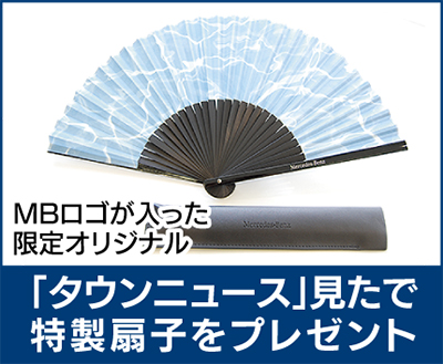 特典として「タウンニュースを見た」で来店者全員にMBロゴ入りオリジナル扇子プレゼント。この機会にぜひ。
