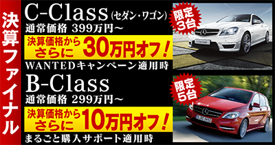 期間中はベンツの魅力がつまった定番モデルCクラスと機能性と手軽さで20代から30代からの支持も多いBクラスが衝撃価格に。Cクラスは限定3台で決算価格のファイナルプライスから、さらに30万円オフ。Bクラスは限定5台で同様のファイナルプライスから10万円オフになる。今だからできる台数限定の特価だ。