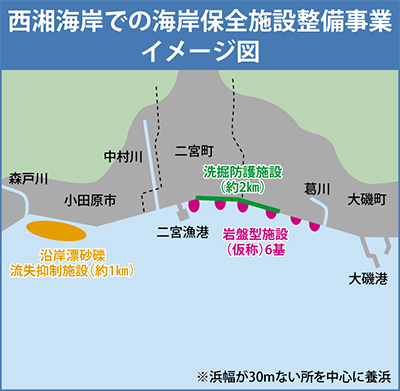 砂の流出による浸食被害が深刻な西湘海岸で、国が2014年度から直轄事業として砂浜復元に着手する見通しとなった。新工法の岩盤型施設(仮称)など高度な技術と、約181億円という大規模な予算を投じて砂浜の回復と保全に取り組む。