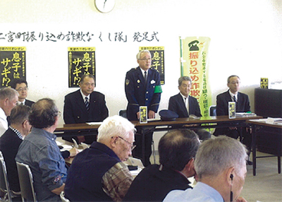 振り込め詐欺撲滅対策の一環として、二宮町老人クラブ連合会(伊藤勲会長)の会員を中心に「振り込め詐欺なくし隊」が結成され5月2日、二宮町町民センターで発足式が行われた。