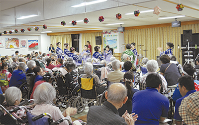 夕方6時30分から始まったこの催しは、今年は降雨の可能性があったため、屋内での開催となった。施設が用意したステージで東京音頭や炭坑節などの盆踊りが披露されると、入所者は一緒に手を叩いたり、職員らのバンドが「北国の春」や「上を向いて歩こう」などを演奏すると、一緒に声を出して歌うなど、元気にひと時を過ごした。