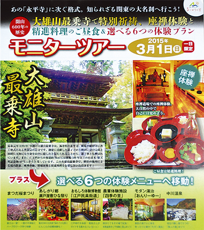 今回のツアーでは大雄山最乗寺での特別祈祷と座禅体験、精進料理の昼食をメーンに、参加者が選択した各市町の観光スポットへタクシーで向かう。