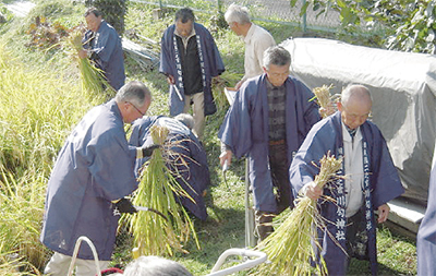 神前に供える米を収穫する神事の抜穂祭が、川勾神社の神饌田で18日に執り行われた。水田の奉耕主を務める西山家、同神社の宮司と役員など関係者が参列。豊作に感謝し、鎌で丁寧に稲を刈った。