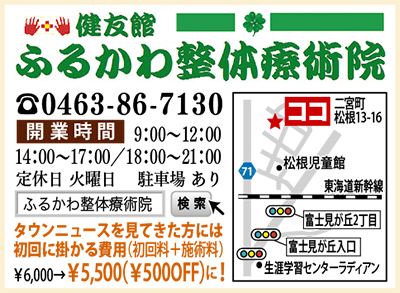 二宮町の「ふるかわ整体療術院」は30年の実績を持つ健友館整体の技術を用いた整体院。 自然治癒力を呼び覚まし、整体の効果を高める独自の技術を提供している。「来院者に一番適した施術を」がモットーだ。