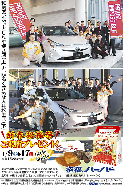 「うれしいこと、全力で」。今年もトヨタカローラ神奈川平塚西店と大井松田店には、スタッフの明るい笑顔が満ちている。さらなる進化を遂げた新型プリウスの魅力を体感してもらおうと、店頭には試乗車が登場。新春は1月5日(火)から営業、9日(土)から17日(日)まで、新春招福祭が開催される。
