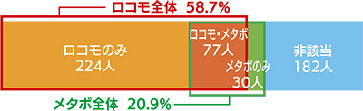 同事業の広報を担う株式会社アネティがまとめたレポートによると、ロコミルを利用した男性210人・女性303人のうち、ロコモの該当者は約6割の301人。内臓脂肪型肥満に高血圧、高血糖などの症状が重なった「メタボリックシンドローム」(メタボ)と診断された107人を大きく上回った。