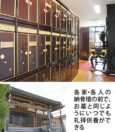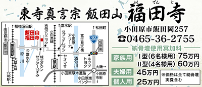 昨年、小田原市飯田岡の飯田山福田寺に完成した納骨堂は、古刹ならではの安心感に包まれた、小田原で初めての納骨壇形式。各家・各人が各々の納骨壇をもち、屋内で礼拝供養ができる。特に夫婦用の納骨壇の人気が高く、数が少なくなっている。