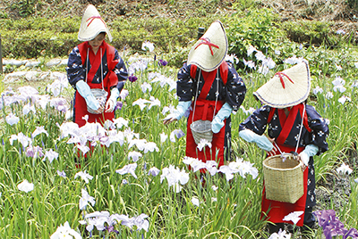 約1万株のハナショウブが咲き誇る二宮町のせせらぎ公園で、早乙女姿の女性による花がら摘みが行われている。ハナショウブは1本の茎に2つのつぼみが付き、咲き終わった一番花の花がらを摘むことで二番花がきれいに咲くという。