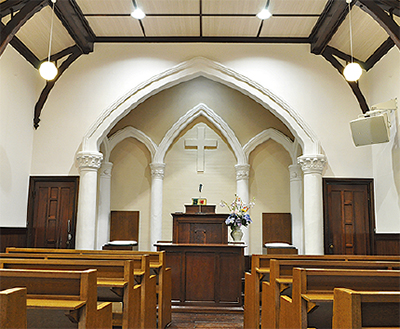 礼拝堂(=写真)は昭和初期の教会建築を今にとどめており希少価値が高く、調査を行った日本建築学会は、保存が望ましく改修で維持も可能と判断。地域住民からも建て替えを惜しむ声が上がっていたことから、既存の設備を生かす改修計画に変更した。