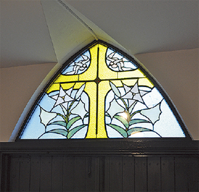 昨年3月に工事を終え、当時の面影を残しつつ耐震や耐火、バリアフリー工事を行い、トイレや礼拝堂奥の集会場、2階の和室などを改修。玄関のステンドグラスは、室内側の壁が取り除かれて光が差し込むようになった。