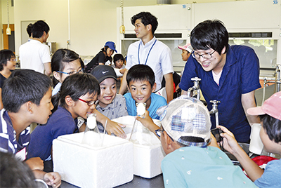 大磯小学校と国府小学校の児童27人が8月19日、一日大学生となって神奈川大学湘南ひらつかキャンパスを訪れた。理学部の日野晶也教授の講座に参加し、科学実験を行った。大磯町が実施している、小学生に遊びと学びの場を提供する「夏休み放課後子ども教室」の一環。