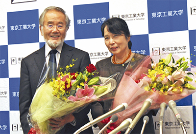 大隅さんの研究室がある東工大すずかけ台キャンパス(横浜市緑区)の会見場。2人が姿を見せると報道陣のカメラが一斉にフラッシュを光らせ、大学関係者や学生から歓喜の拍手がわいた。花束を受け取った大隅さんは「多くの共同研究者、友人に恵まれ、とても自由に研究ができたおかげ」と、周囲の支えに対して感謝の言葉を述べた。