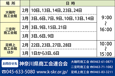 加えて消費税の転嫁対策の相談なども受け付けている。開催日時などの詳細は下表を参照。事前予約が必要。