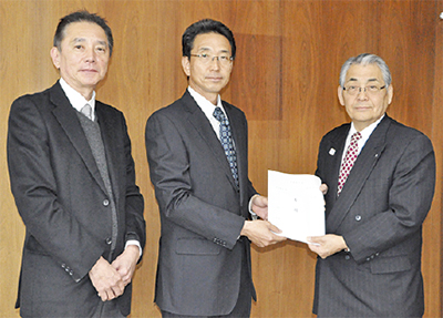 中井町田中・古怒田地区で砂利採取を行う5事業者で組織する協同組合西湘グラヴェル(伊藤義昭理事長)が、町へ50万円を寄付した。21日に副理事長らが町役場を訪れ、杉山祐一町長に手渡した。