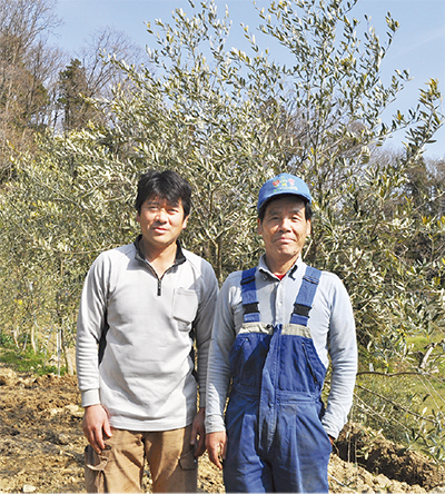 二宮ブランドのコンセプトである健康長寿にふさわしく、温暖な気候が栽培に適し、荒廃農地の活用に役立つことなどから、町では2012年度からオリーブの栽培普及に着手。実だけでなく、葉を使った加工品の開発に向け、ユニバーサル農場の濱田治郎さんとまつき農園の松木秀雄さんが町商工会の呼び掛けに応じ、茶づくりに取り組んだ。