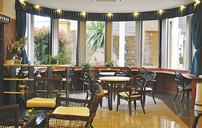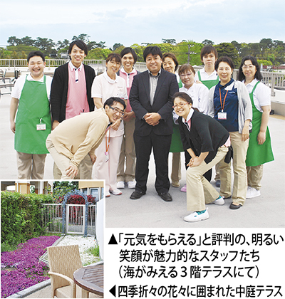 豪華客船をイメージしたホーム内には、広々とした共有スペースが充実。展望テラスからは青い海と、季節ごとに色彩を変える山並みを望むことができる。ゲストルームがあるので、家族も宿泊が可能。お花見や納涼祭などスタッフ力作の企画や、寿司職人が目の前で握る食のイベントなど目白押しで、明るい笑顔と活気に満ちている。