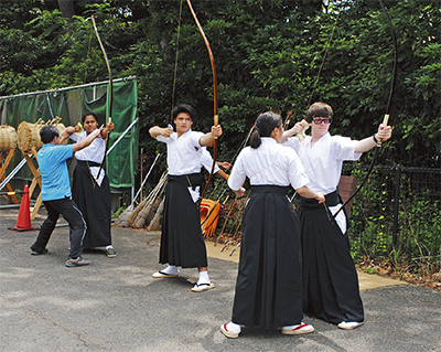 弓道部では道衣と黒い袴、足袋を身に着けて基本の立ち姿勢から学んだ。理想の型に苦労する米国人高校生に対し、部員が手を添えて頭の向きや弓の構え方などを丁寧に指導した。「矢が的に当たっても外れても、喜んだり悔しがったりして気持ちを表に出してはいけない」。顧問の中田稔教諭の説明と、暑さの中で心身を鍛錬する部員の姿に派遣生は何度もうなずいた。