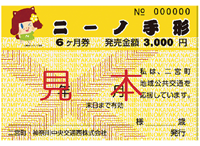 運賃が100円引きになる「ニーノ手形」は6カ月券3000円、12カ月券5000円。定期券タイプの「ミーヤ手形」は、町内在住の満75歳以上と妊産婦などが購入対象で、6カ月券5000円、12カ月券8000円。町外の祖父母がコミュニティバスに乗って二宮町に住む未就学児の孫に会いに行く場合にもミーヤ手形を利用できる。運転免許を返納して1年以内の人は、ニーノ手形12カ月券を1回に限り無料でもらえる特典がある。