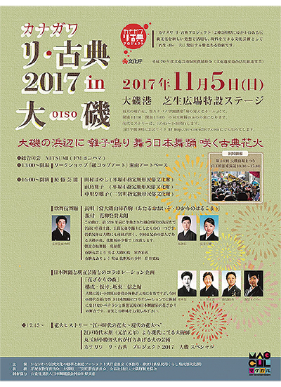 神奈川にゆかりある伝統文化を新しい発想で活用するイベント「カナガワ リ・古典プロジェクト2017大磯」が、11月5日に大磯町で開催される。大磯港の芝生広場にステージを設け、お囃子や歌舞伎、日本舞踊といったプログラムを「現代を生きる文化芸術」として発信する。