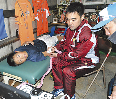 年1回の検診に協力している横浜ベースボール整骨院の吉田干城院長とスタッフが、小学2年から6年の団員約30人を対象にエコー(超音波)検査で肘の軟骨や靭帯の状態を確認。体の柔軟性や腕、足の可動域なども測定し、効果的なストレッチの方法を指導した。キャッチャーの佐藤亮輔君(8)は「どこにも悪い所がなくて良かった。体が硬いとけがをしやすいと聞いたから、ちゃんとストレッチをします」と笑顔を見せた。