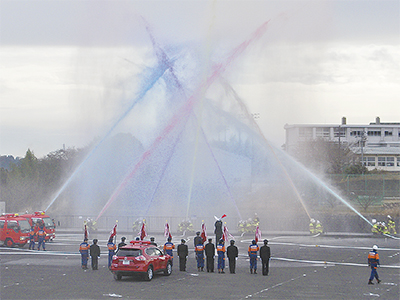 7分団128人の団員と消防職員を前に杉山祐一町長は「町民が安心して暮らせるよう、今後も消防活動への尽力をお願いしたい」とあいさつした。式典後に一斉放水試験があり、7色の水が空高く放たれた。