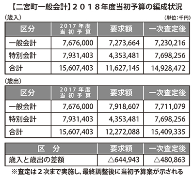 2018年度当初予算の編成を進める二宮町は、1次査定を終えた段階で歳出超過が4億8千万円に上る編成状況を公表した。2次査定や調整を経て収支の均衡を図るが、財源不足に伴う厳しい町政運営が迫られる。