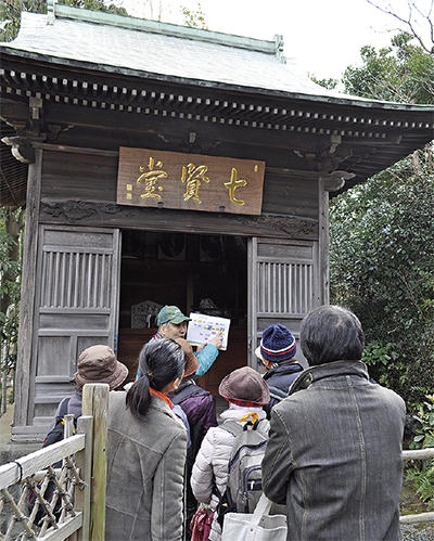 堂内には伊藤博文や西園寺公望、吉田茂など大磯町ゆかりの首相をはじめ、岩倉具視、大久保利通、三条実美、木戸孝允の写真が掲げられており、普段は公開されていない。特別開扉を目的に訪れた観光客らは大磯ガイド協会の会員による解説に耳を傾け、歴史上の元勲が活躍した時代に思いをはせながら堂内を興味深げに覗き込んでいた。平塚から見学に訪れた80代の夫婦は「ガイドさんの説明で七賢堂の由来や歴史が良く分かった。旧吉田邸や庭園も素晴らしいので、ぜひまた散歩に来たい」と話した。