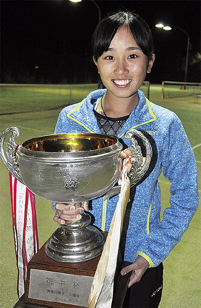 大川さんは、1月の「川崎ジュニアテニス選手権」でも優勝しており、これで2冠を達成。3月31日まで開催中の「県ジュニアテニス選手権」でも優勝を狙う。大川さんは「優勝はうれしいが反省点もあった。もっと練習に励んで3冠達成と、関東大会を経て全日本で上位入賞を目指したい」と意気込みを語る。