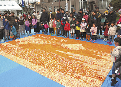 二宮町の特産品であるみかんの皮を使って特大のモザイクアートを作るイベントが2月25日、ラディアン前広場で行われた。町内と秦野市などから親子や友人同士ら30組約100人が参加した。町商工会青年部が毎年実施している地域交流事業「ふれあい広場」の33回目。