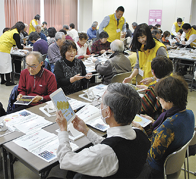 高齢者を対象にしたタブレット型端末の基礎講座が2日、中井町保健福祉センターで開かれた。定員の約1・5倍の申し込みがあり、46人が参加。タッチ操作を学びながらゲームを楽しんだり、カメラやテレビ電話の機能を体験したりした。