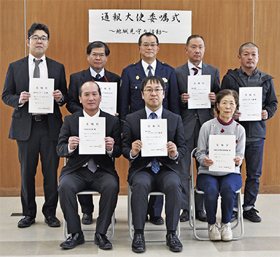 通報大使の委嘱は、松嶋誠署長による発案。県と県内57事業者・団体が地域見守り活動に関する協定を締結するなか、管内の関係団体との連携や通報体制をより強固なものにするのが狙い。同署独自の「通報大使カード」も作成、配布した。