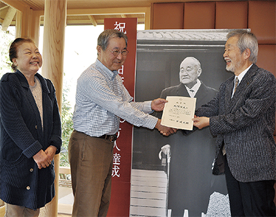 中崎久雄町長から記念品として、町長直筆の10万人目認定証、来年3月まで使用できる旧吉田邸の年間無料パスポート、吉田茂ゆかりの大磯名産品詰め合わせなどが贈られた。犬塚さんは「建物や庭園に興味があり以前から来たいと思っていた。年間パスポートをいただいたので、これからはなるべく足を運んで庭園の季節の移り変わりなどを楽しみたい」と話した。