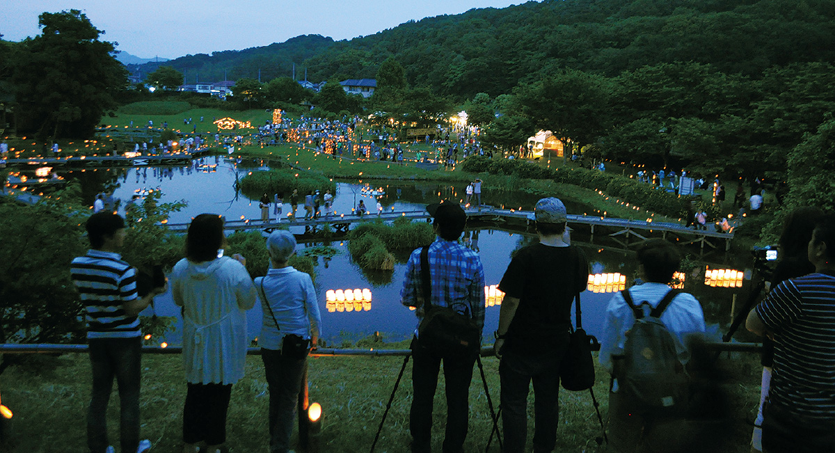 中井町の厳島湿生公園で明かりのイベント「竹灯篭の夕べ」が5月26日と27日に行われ、大勢の家族連れやカメラ愛好者らが幽玄な光の演出を楽しんだ。今年で13回目。