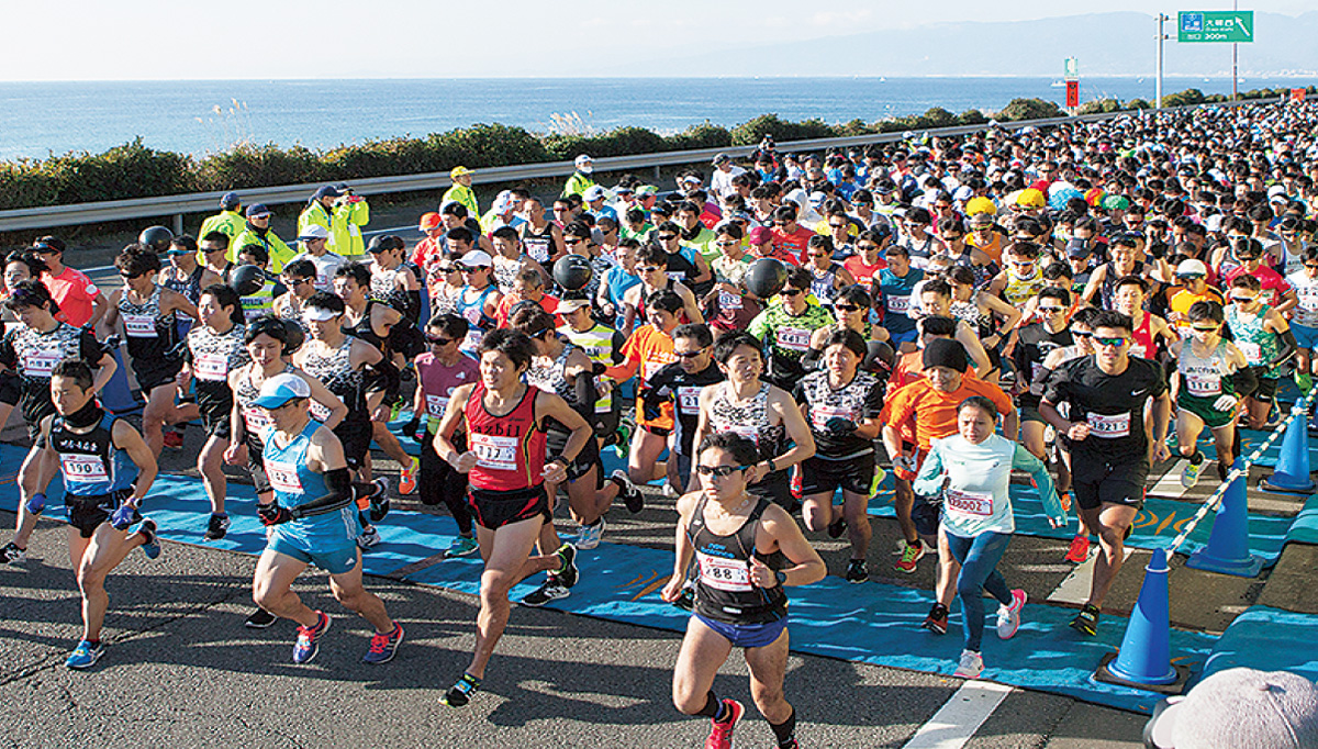 ゲストとして応援に駆け付けた元マラソン選手の千葉真子さんは「相模湾に富士山を望め、海岸線を走るコースは景色がとても良く、走る喜びが実感できる」と魅力を語っていた。昨年は2万1730人が参加した。