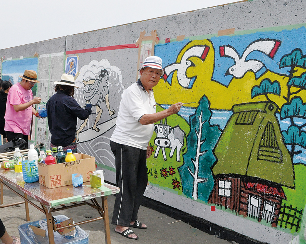 壁画の制作にはデザイン採用者とその家族や友人、青年部など約60人が参加。潮や砂塵に強い塗料を使って、朝9時から夕方までそれぞれのアート制作に取り組んだ。常連参加者の菱間久米雄さん(89)は、幼い頃に目にした藁ぶき屋根の家を描き「面白い企画。これからも参加し続ける」と笑顔を浮かべた。佐藤部長は「地域の景観向上に役立つ場所で事業を継続していきたい」と話した。