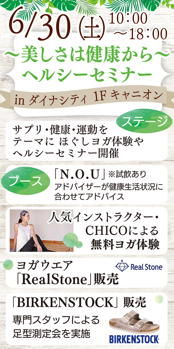 ダイナシティ(小田原市中里296の1)で6月30日(土)、『N.O.U』のアドバイスも受けられる「ヘルシーセミナー」を開催。ヨガの無料レッスンや足型測定体験もあり。この機会に気軽に足を運んでみては。問い合わせは資生堂ジャパン(株)小田原オフィス【電話】0465・23・3221へ。