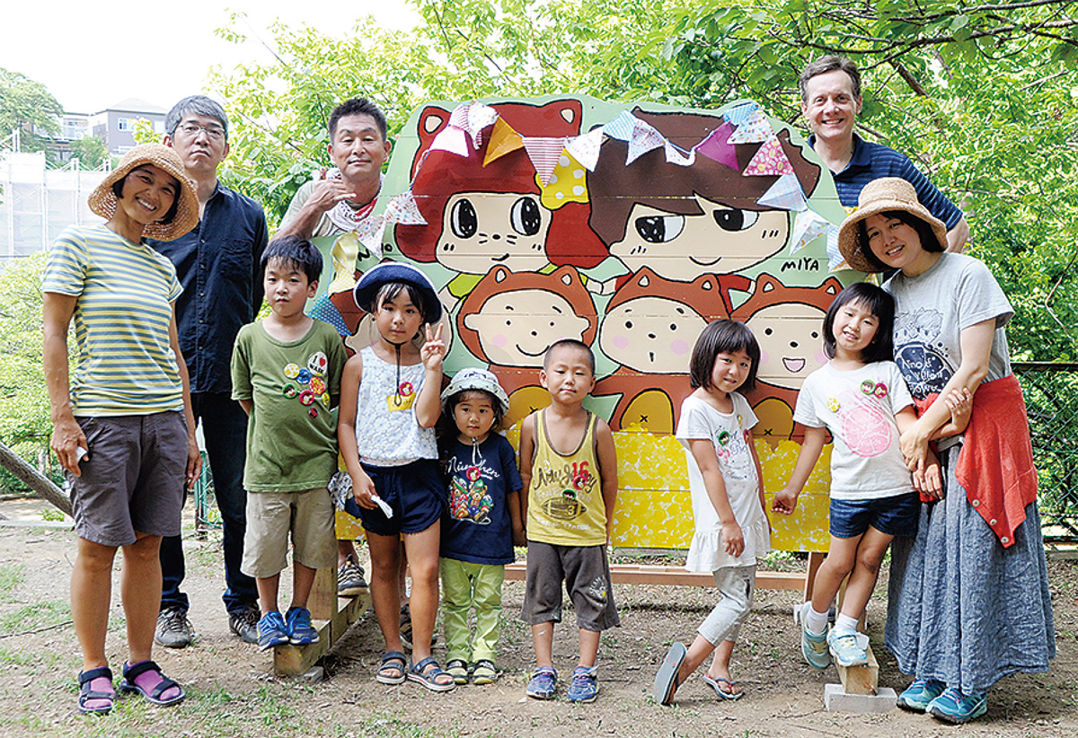 看板には、菜の花畑にいる「ニーノとミーヤ」と4匹の子ダヌキが描かれ、子どもたちが芋判を押して満開の菜の花を表現。キャラクターの生みの親である「東京ハイジ」のクリエーターで、町内に住むササキワカバさんがデザイン画の提供に協力した。